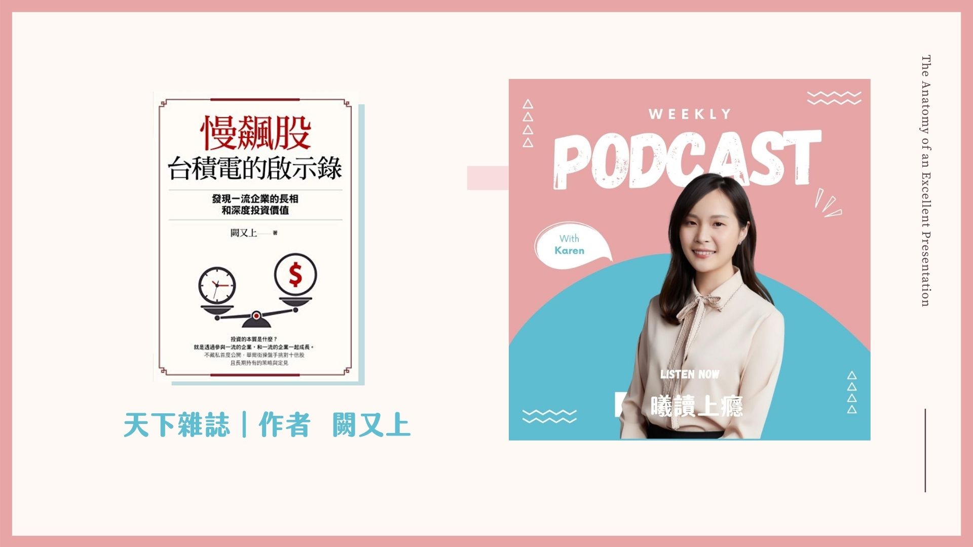 天下雜誌出版的《慢飆股台積電的啟示錄:發現一流企業的長相和深度投資價值》,是由1985年就赴美國的財務規劃師闕又上所撰寫,他於2003年,為自己所管理的共同基金第一次購入台積電,等待18年,台積電成為他資金管理生涯中第十六檔10倍股,在本書中,揭露了台積電是如何搶下蘋果訂單。