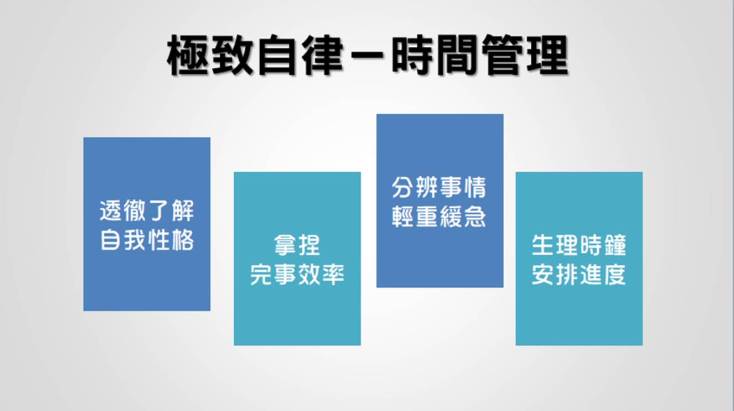 有人說這是極致的自律,可以這麼說,但外界對自律會認為是很嚴格的要求自己去忍住想做的事,像是偷閒、休息,但我定義的極度自律,是個人對自我的了解程度,而非迎合社會給我們的規範或框架,反而「清楚知道什麼時候,適合做什麼事,效率最高」,或是了解自己的缺點,找到其他方法來補足,達成雙倍的能力,才是最好的管理方式。