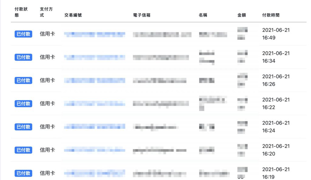第二、老師會很關心的訂單後台,非常視覺化的讓你知道付款狀態、支付方式、交易編號以及會員資料,且這些可以載成excel、CVS,可以很好的二次行銷