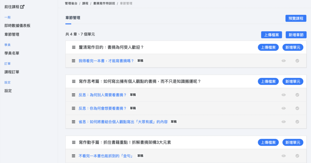 在章節管理、單元新增上,都非常的好用,且在內部上傳檔案時,格式非常多元,因此除了影音檔之外,你也可以上傳附加檔案!而這些都只有限定購買者可以看到。不過你也可以在課程中設定為免費課程,甚至是發放折扣碼。